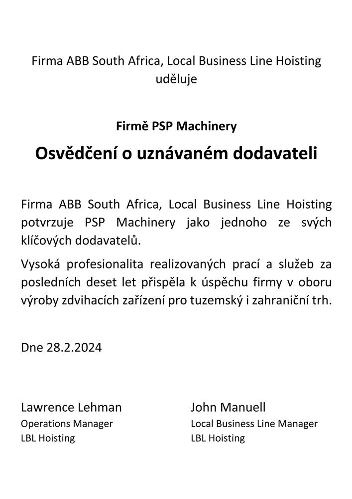 Naší prioritou je vyrábět a dodávat stroje a zařízení prvotřídní kvality a proto nás velice těší uznání od jednoho z našich nejvýznamnějších zákazníků, firmy ABB South Africa.